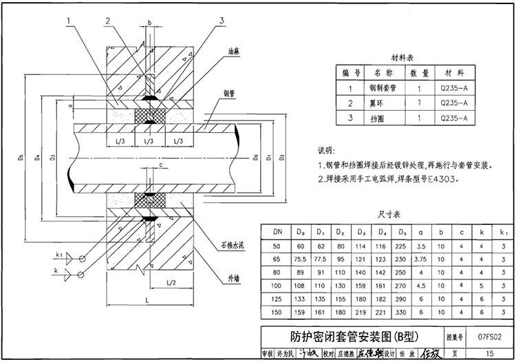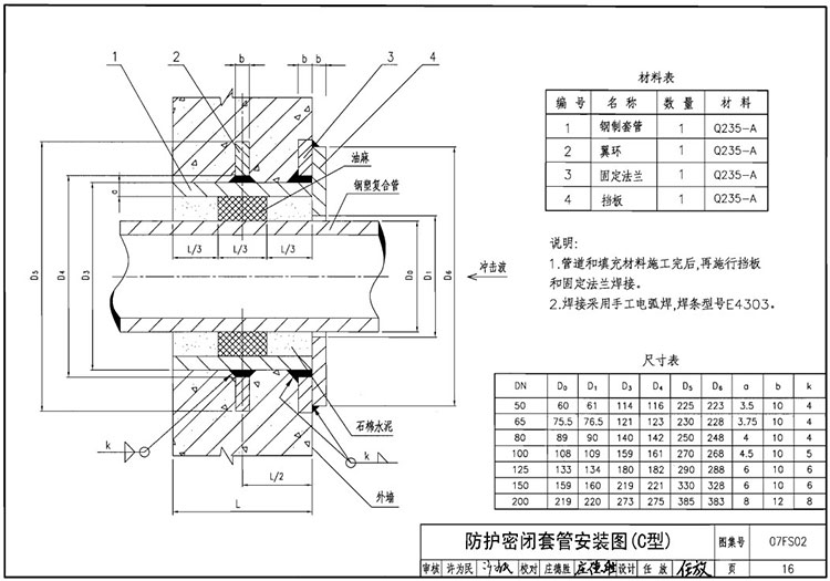 E型;鋼制套管 數量1材質(Q235A)翼環數量1 材質(Q235A) 固定法蘭 數量2 材質(Q235A 擋板數量2 材質(Q235A)管道和填充材料施工完后,再施行擋板和固定法蘭焊接。