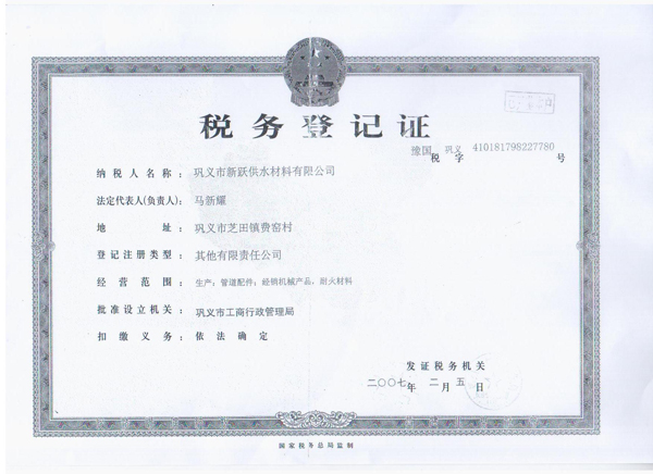 歡迎來到鞏義市新躍供水材料有限公司官方網(wǎng)站!您現(xiàn)在訪問的是:《稅務(wù)登記證》頁面,如需幫助請致電:13140066578 或 0371-64100988